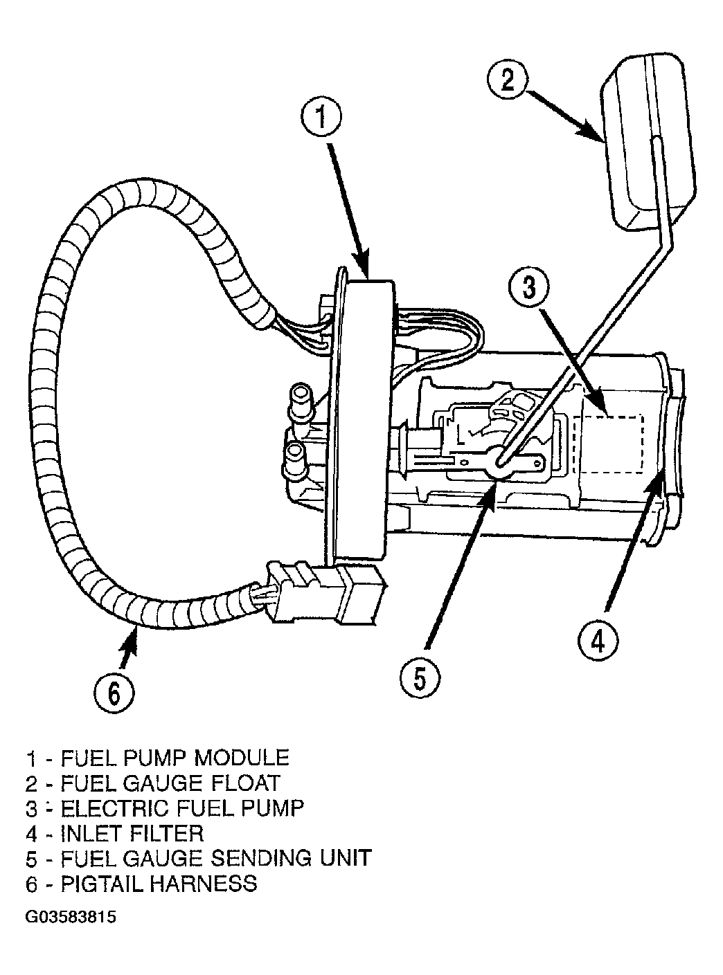 The fuel pump module is installed in the top of the fuel tank (Fig 1 ). The fuel pump module (Fig 2 ) contains the following components: