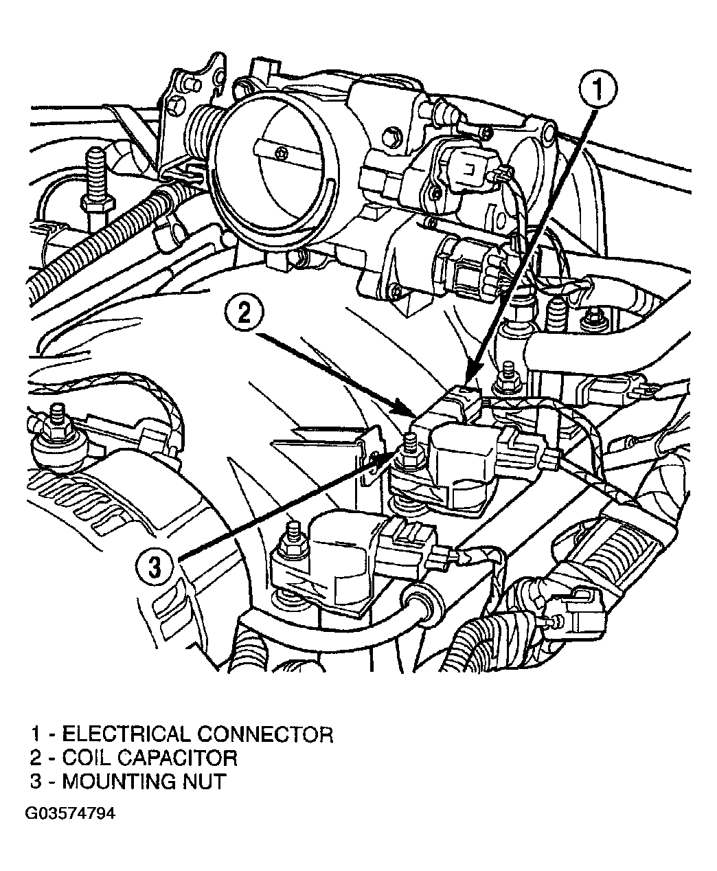 Two coil capacitors are used. One of them is located near the center of, and on the left side of the intake manifold (Fig 1 ). The other capacitor is located near the center of, and on the right side of the intake manifold.
