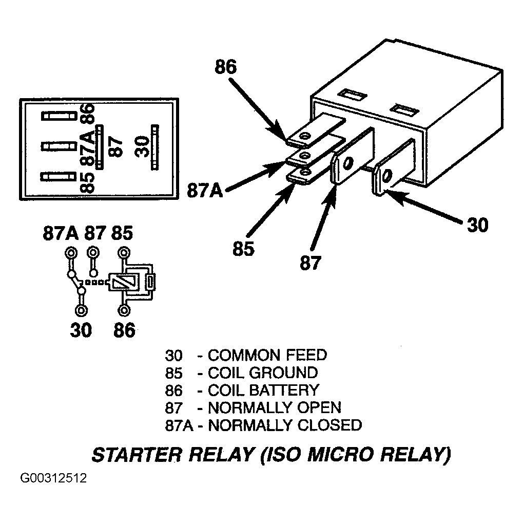 - A relay in de-energized position should have continuity between terminals 87A and 30, and no continuity between terminals 87 and 30. If OK, go to Step 3. If not OK, replace faulty relay.