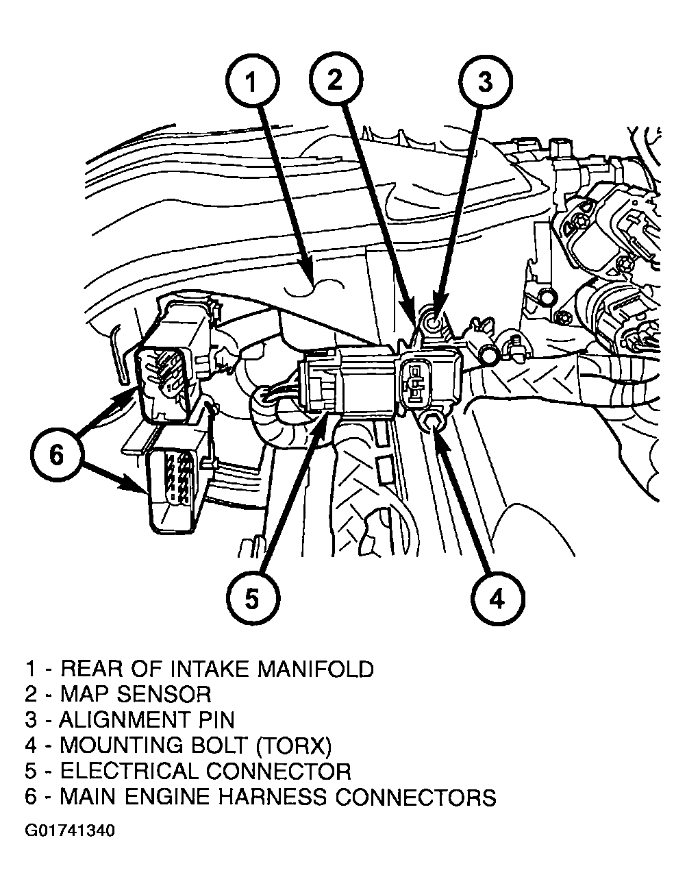- Connect 2 main engine harness connectors at rear of intake manifold. See Figure.