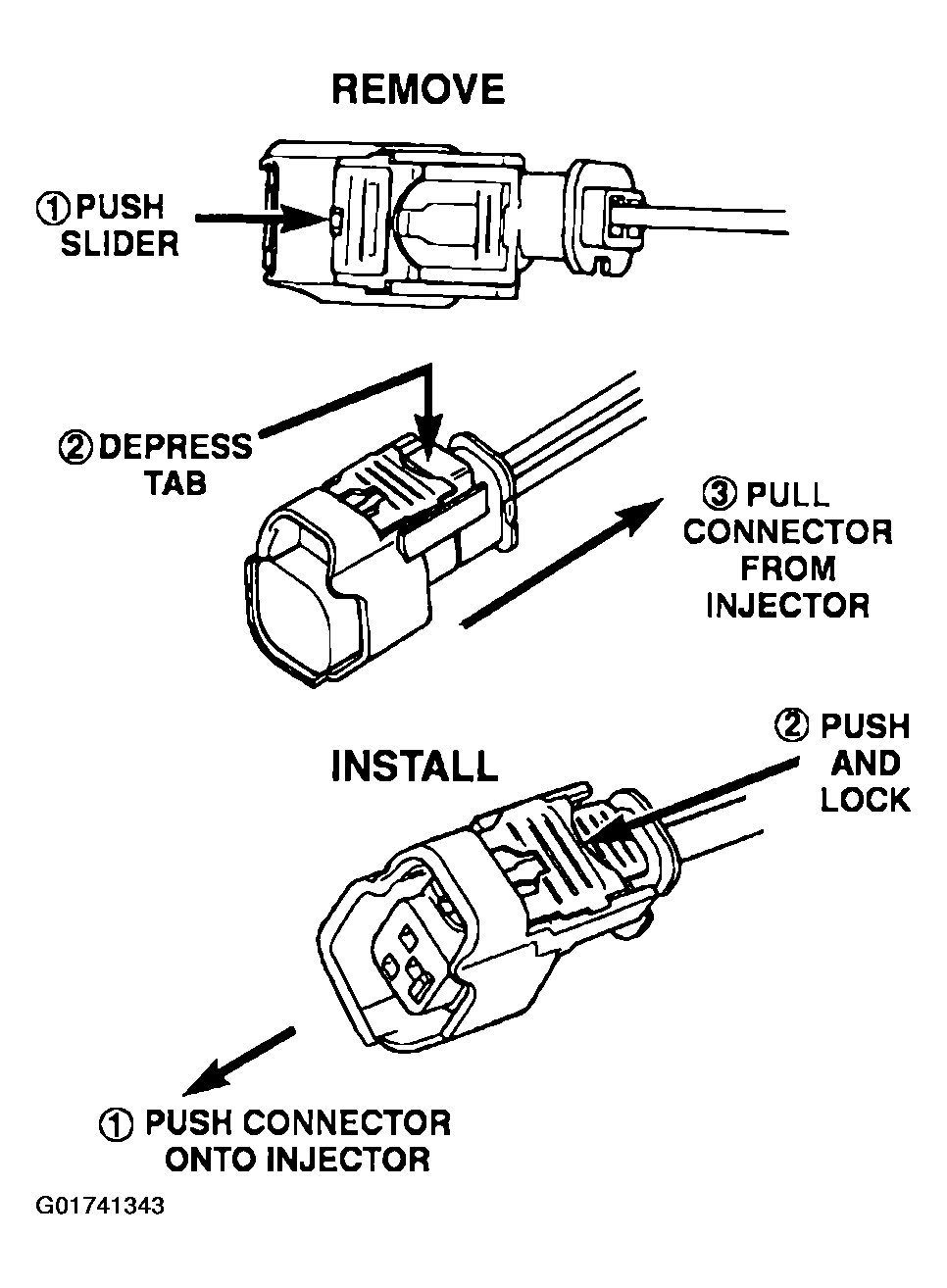 - Connect electrical connectors at all fuel injectors. To install connector, refer to Figure. Push connector onto injector (1) and then push and lock red colored slider (2). Verify connector is locked to injector by lightly tugging on connector.