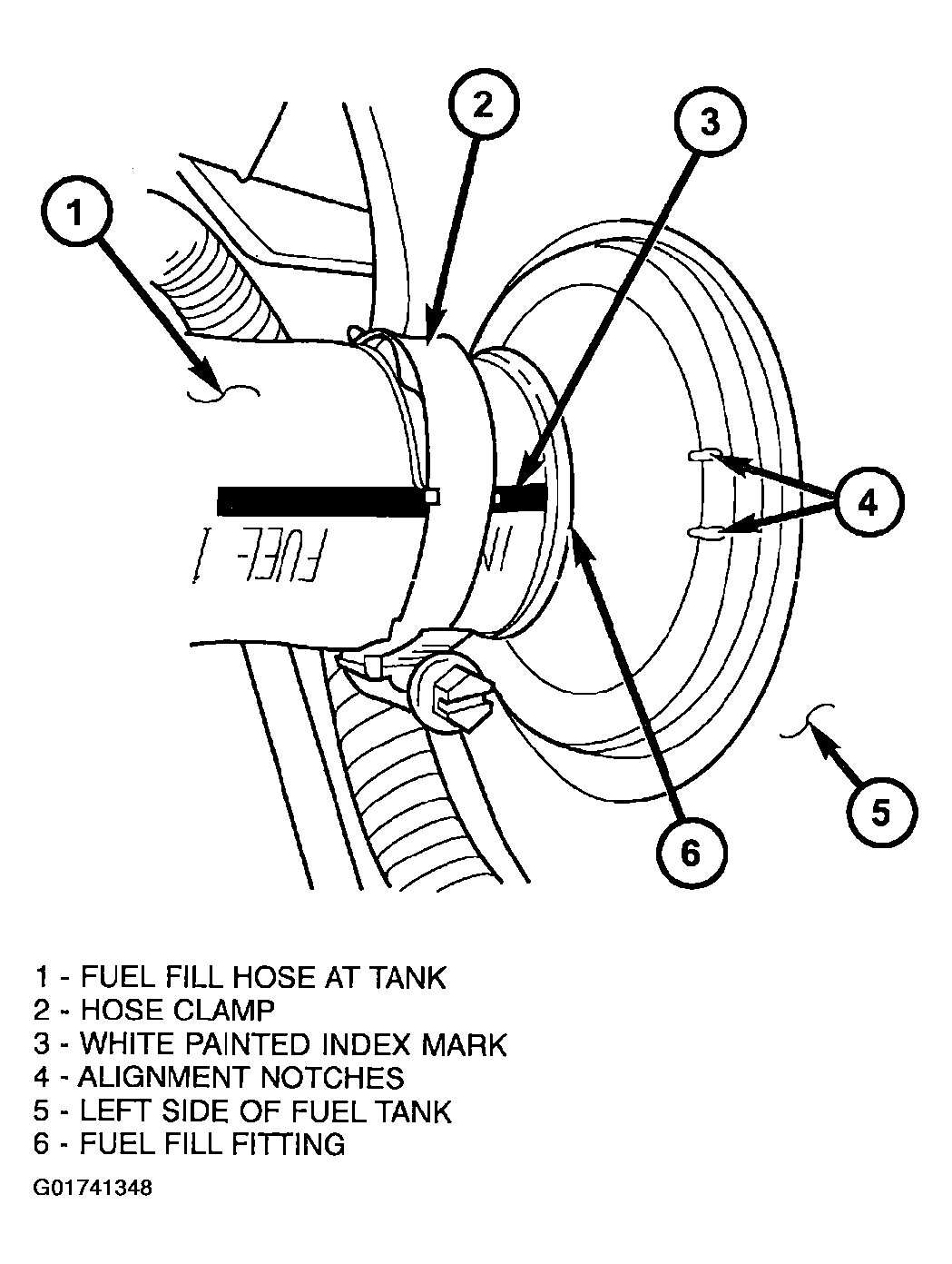 - Install fuel fill hose and hose clamp to fuel tank fitting. Rotate hose until white painted index mark on hose is located between alignment notches on fuel tank fitting. See Figure. Tighten clamp to 3.4 N.m (30 in. lbs.) torque.