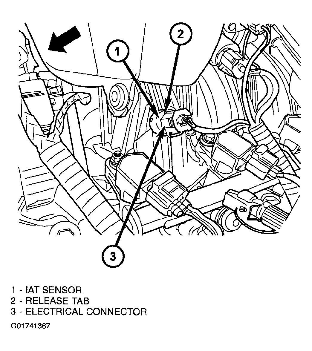 The intake manifold air temperature (IAT) sensor is installed into the left side of intake manifold plenum. See Figure.