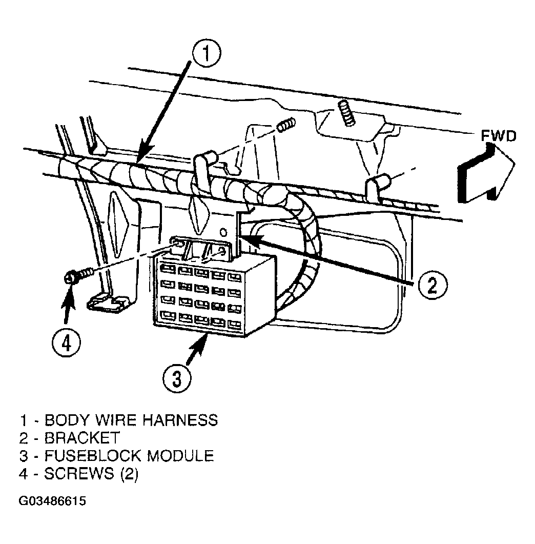 - Remove the two screws that secure the fuse block module to the bracket on the dash panel (Fig 2 ).