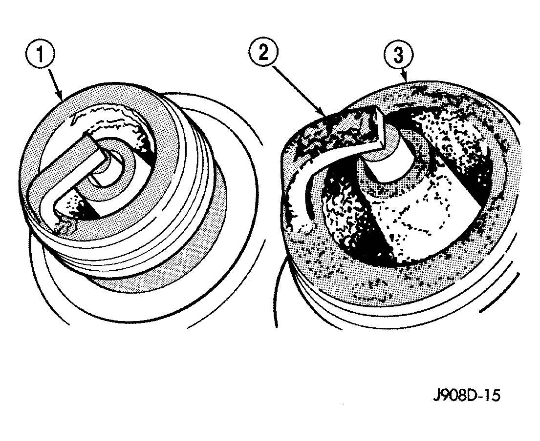 The few deposits present on the spark plug will probably be light tan or slightly gray in color. This is evident with most grades of commercial gasoline. See Fig 1. There will not be evidence of electrode burning. Gap growth will not average more than approximately 0.025 mm (.001 in) per 3200 km (2000 miles) of operation. Spark plugs that have normal wear can usually be cleaned, have the electrodes filed, have the gap set and then be installed.