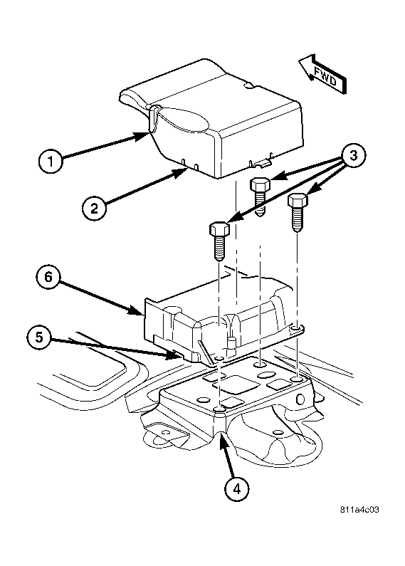 - Install and tighten the three screws that secure the ACM to the ACM bracket that is welded onto the floor panel transmission tunnel. Tighten the screws to 11 N.m (8 ft. lbs.).CAUTION: The lever arms of the wire harness connectors for the ACM MUST be in the unlatched position before they are inserted into their connector receptacles on the ACM or they may become damaged.