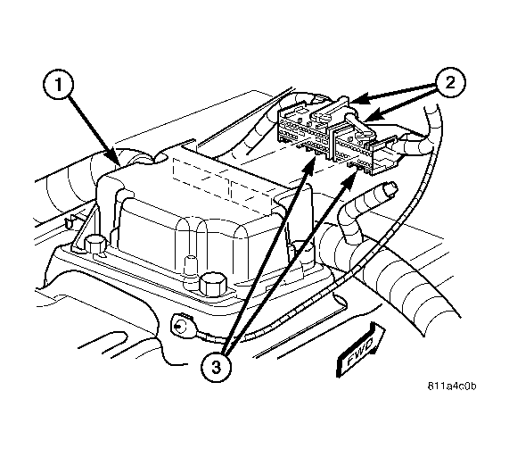 - Reconnect the two wire harness connectors (one each from the instrument panel and the body wire harnesses) for the ACM to the ACM connector receptacles located on the forward facing side of the module. See Figure. Be certain that the latches on both connectors are each fully engaged.