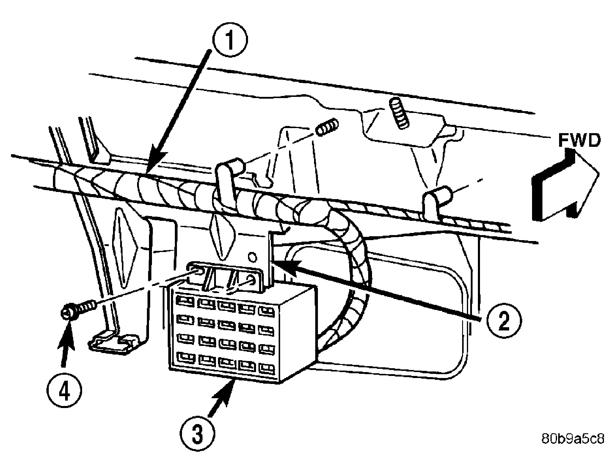 1 - BODY WIRE HARNESS 2 - BRACKET 3 - FUSE BLOCK MODULE 4 - SCREWS (2) - Remove the fuse block module and the body wire harness from the dash panel as a unit.