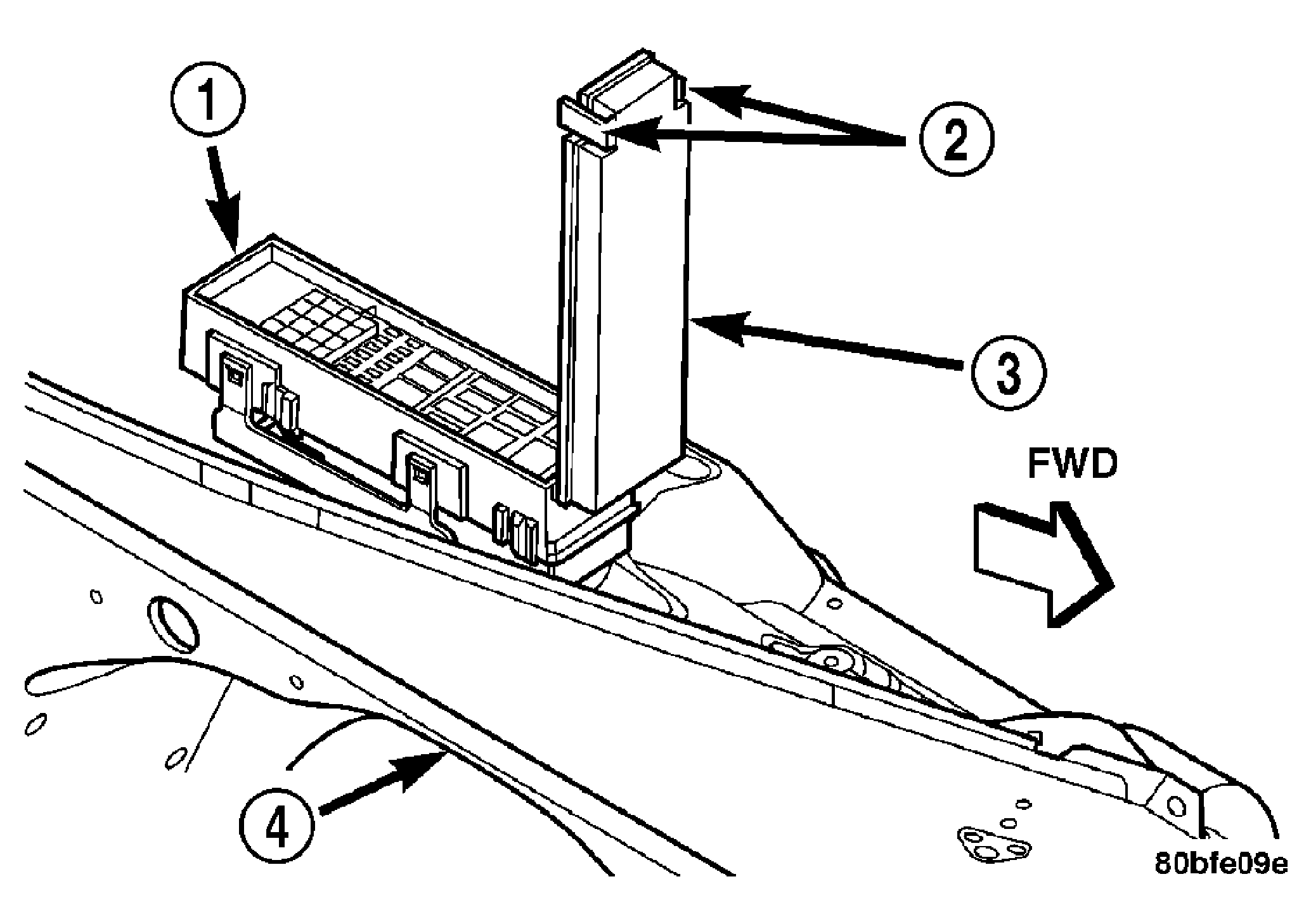 The PDC housing is secured in the engine compartment at four points. Integral mounts on both sides of the PDC housing engage and latch to stanchions that are integral to the stamped steel PDC bracket. The PDC bracket is secured to the top of the right front inner fender shield with three screws, two at the front of the bracket and one at the rear. The PDC is integral to the dash wire harness, which exits from the bottom of the PDC housing. The PDC housing has a molded plastic cover that includes two integral latches at the rear and pivot hooks at the front that snap over a hinge pin on the front of the PDC housing. The PDC cover is easily opened or removed for service access and has a convenient fuse and relay layout map integral to the inside surface of the cover to ensure proper component identification.