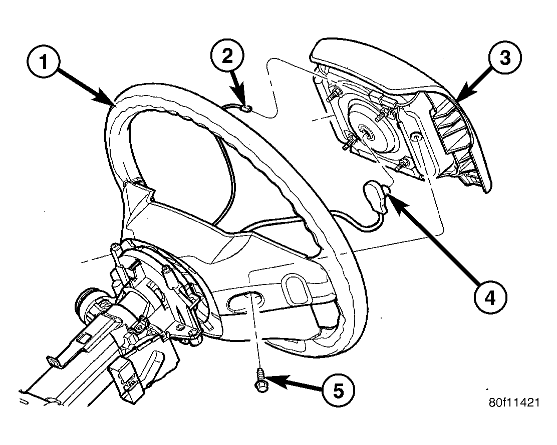 - Carefully position the driver airbag in the steering wheel. Be certain that the clockspring pigtail wires and the steering wheel wire harness in the steering wheel hub area are not pinched between the driver airbag and the steering wheel armature.