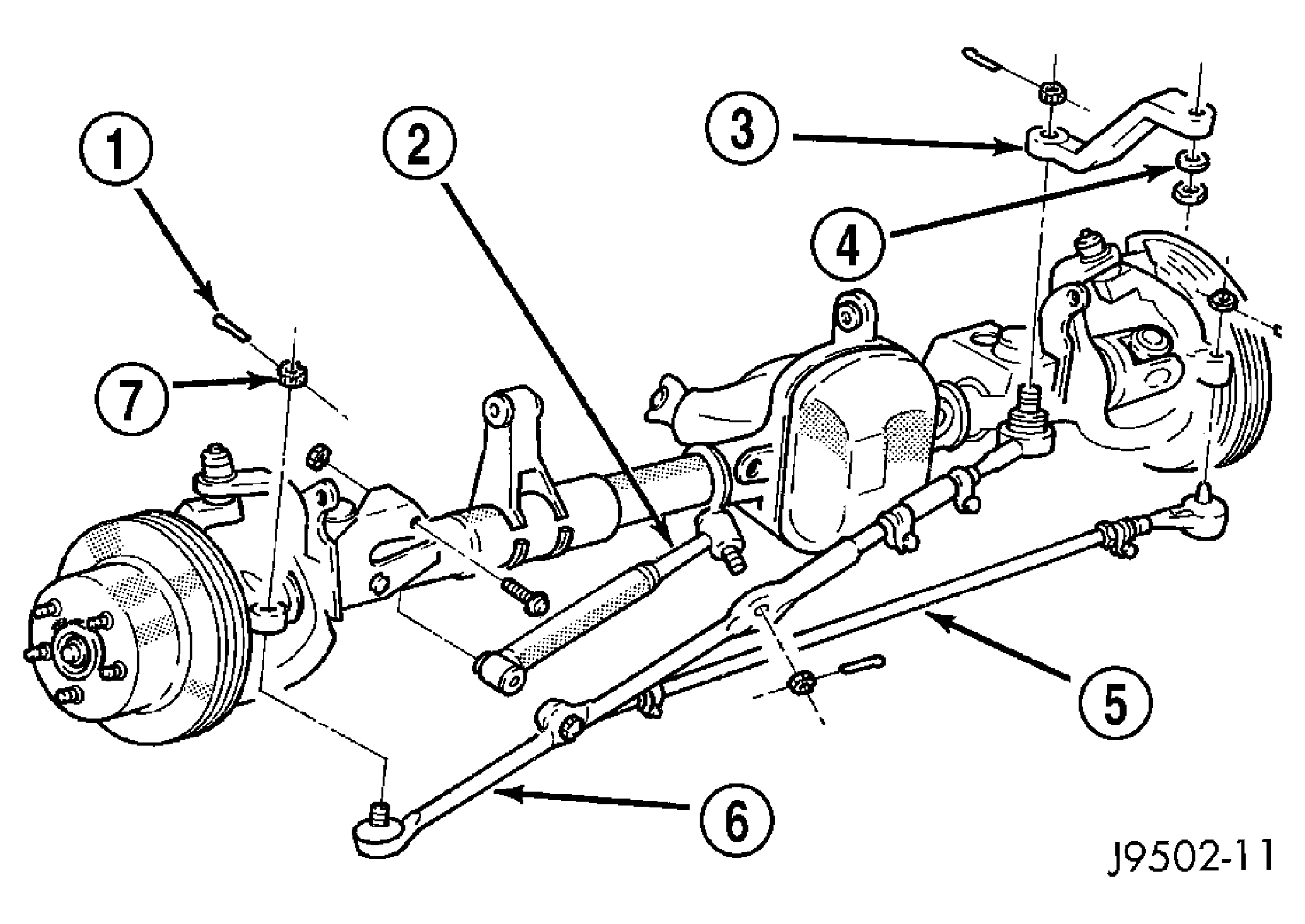 1 - TIE ROD CLAMP 2 - DRAG LINK CLAMPS 1 - COTTER PIN 2 - DAMPENER 3 - PITMAN ARM 4 - WASHER 5 - TIE ROD 6 - DRAG LINK 7 - NUT - Adjust the left wheel toe position with the tie rod. Turn the sleeve until the left wheel is at the same TOE-IN position as the right wheel. Position the clamp bolts as shown and tighten to 27 N.m (20 ft. lbs.). See Fig 1. Make sure the toe setting does not change during clamp tightening.