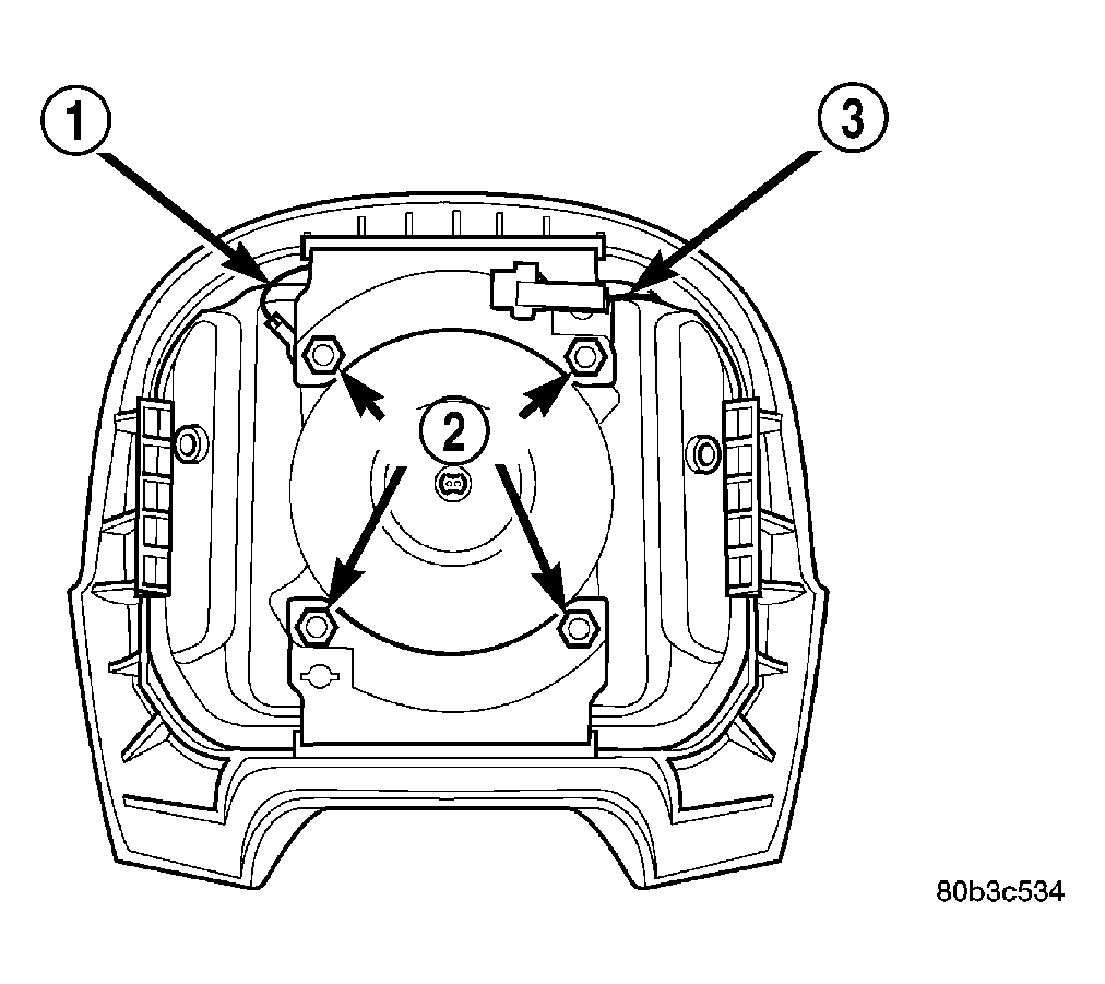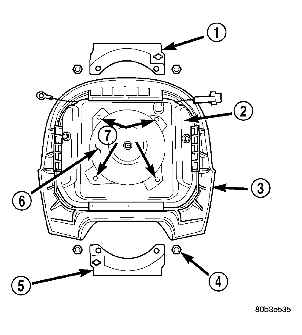 1 - UPPER RETAINER 2 - AIRBAG HOUSING 3 - TRIM COVER 4 - NUT (4) 5 - LOWER RETAINER 6 - INFLATOR 7 - STUD (4) - Disengage the horn switch feed pigtail wire connector retainer from the mounting hole in the upper trim cover retainer.