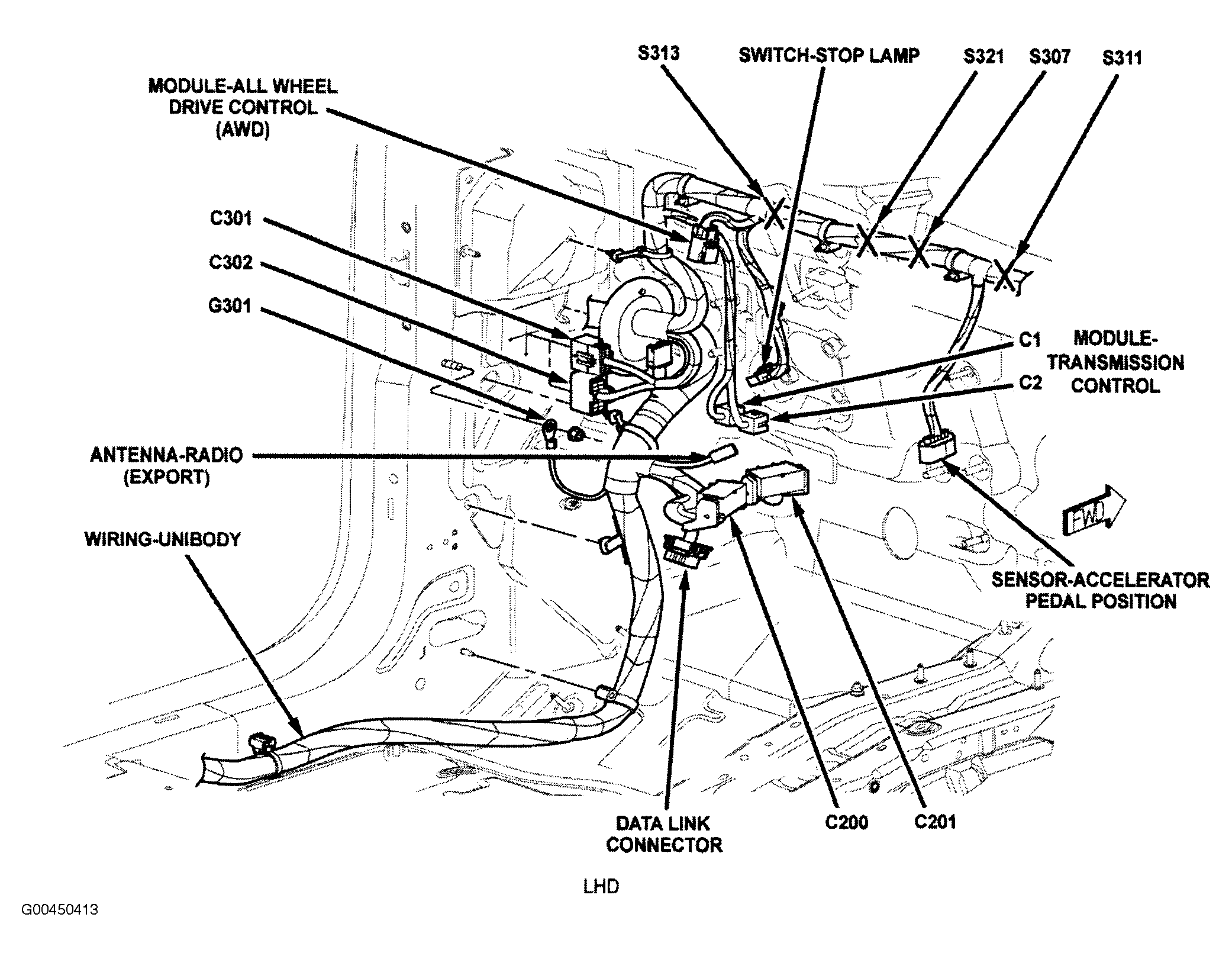 | All Wheel Drive Control Module (AWD) | Left kick panel near grommet to engine compartment. See Figure. |