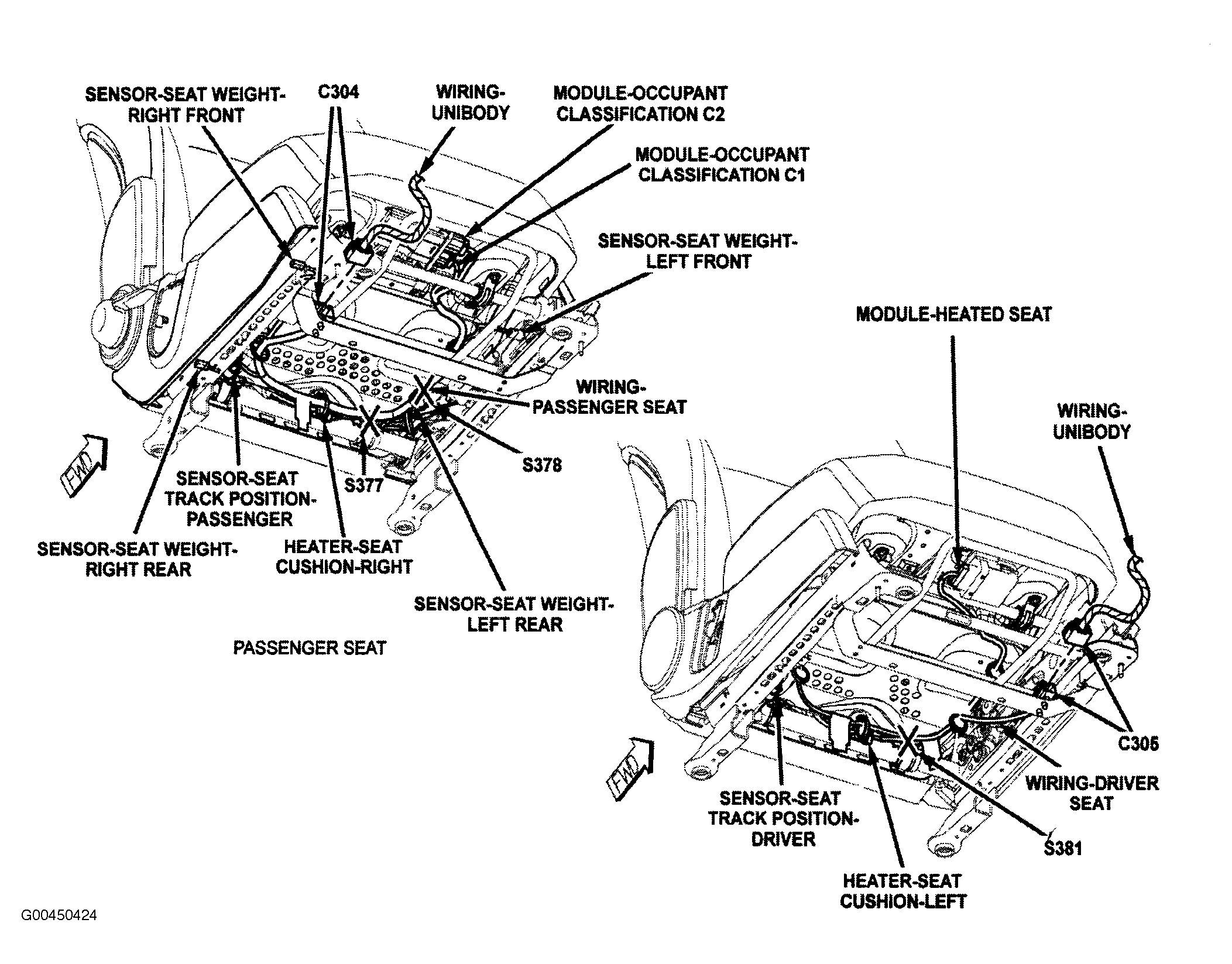 | Occupant Classification Module | Front of passenger seat. See Figure. |