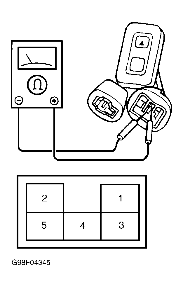 Turn ignition off. Disconnect passenger power window switch harness connector. Using an ohmmeter, check for continuity between specified switch terminals while operating switch. See appropriate PASSENGER POWER WINDOW SWITCH CONTINUITY table. See Fig 1 or Fig 2 . Replace passenger power window switch if continuity is not as specified.