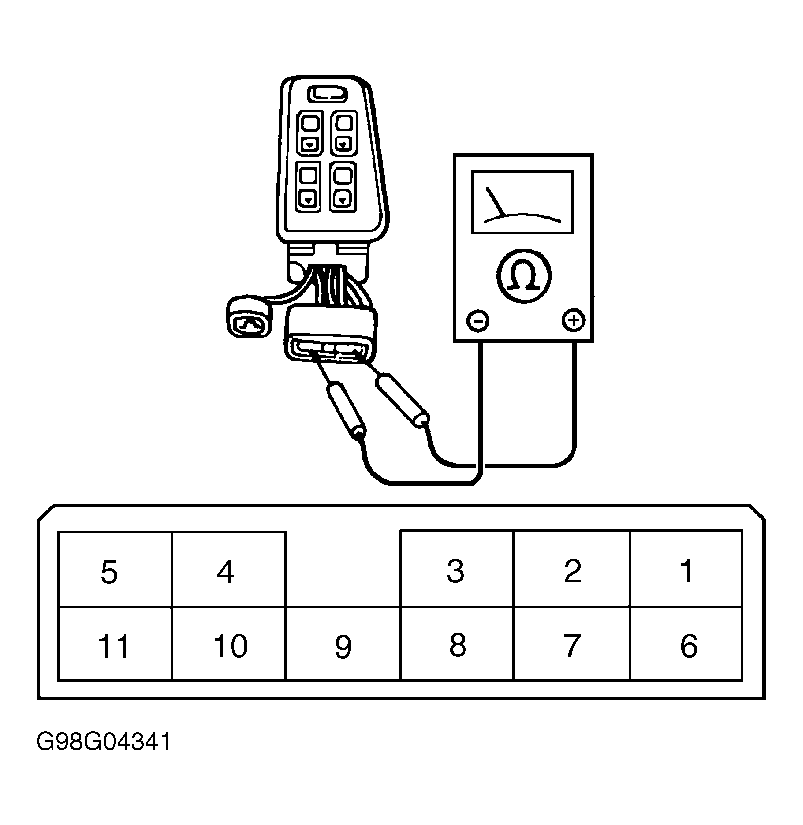 Turn ignition off. Disconnect master power window switch harness connector. Using an ohmmeter, check for continuity between specified switch terminals while operating switch. See MASTER POWER WINDOW SWITCH CONTINUITY (SEPHIA & SPECTRA) or MASTER POWER WINDOW SWITCH CONTINUITY (SPORTAGE) table. See Fig 1 or Fig 2 . If continuity is not as specified, replace master power window switch. Retest system.