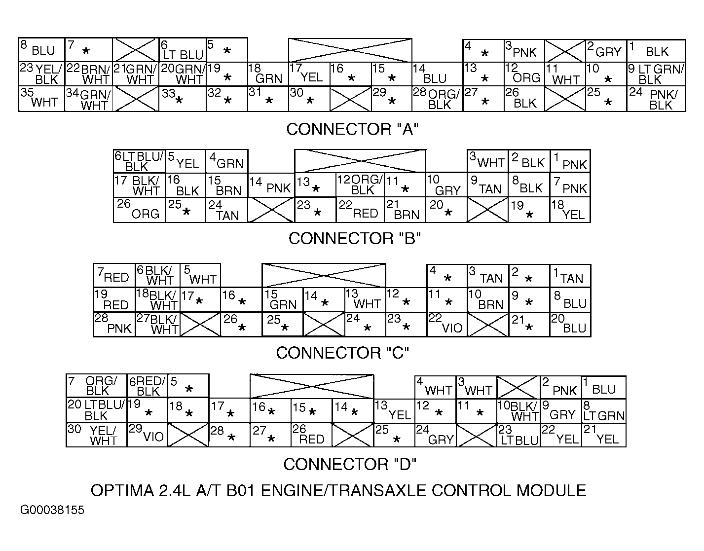Fig 1: Identifying Engine Control Module Connectors & Terminals (Optima & Magentis (Canadian) 2.4L A/T)