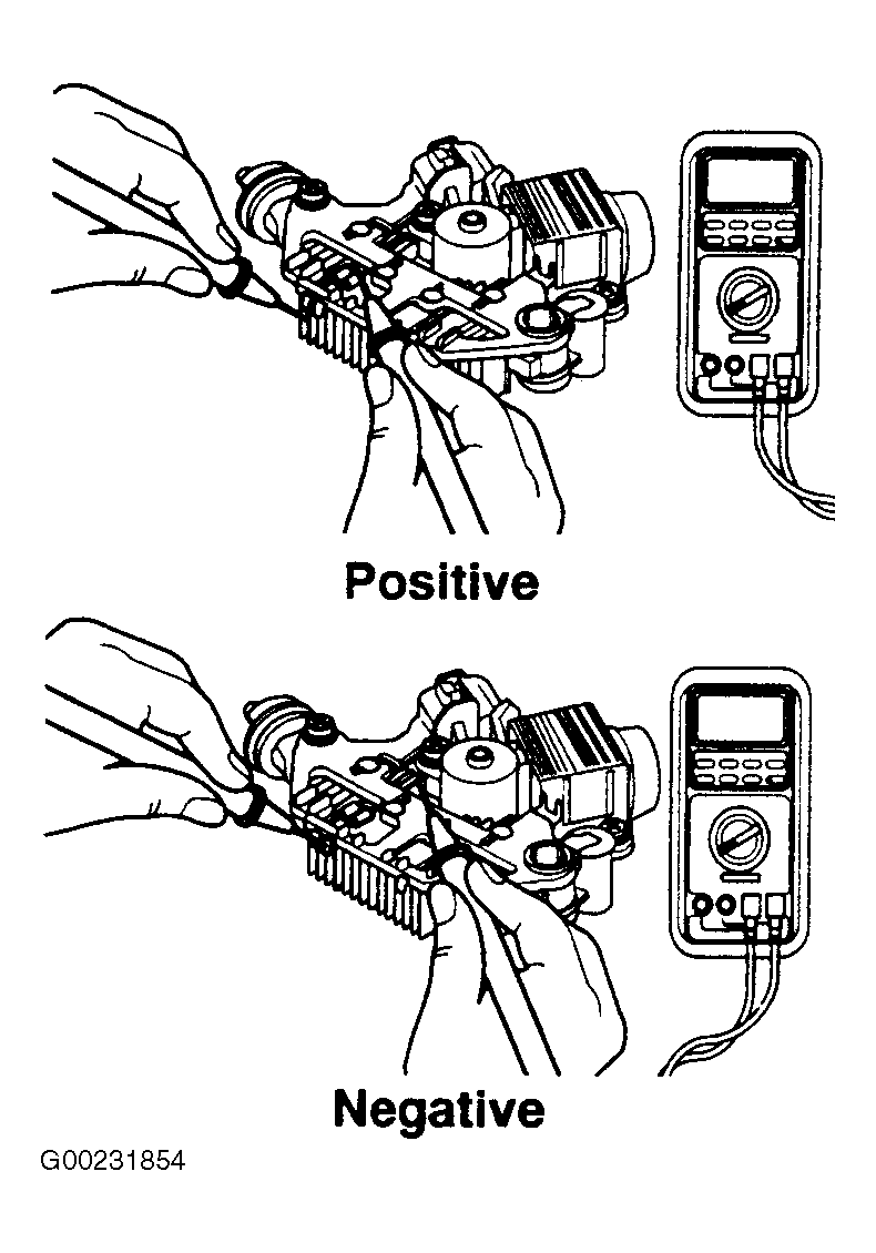 Using ohmmeter, check for continuity between positive rectifier and stator coil lead connection terminal. Continuity should exist in one direction only. Check for continuity between negative rectifier and stator coil lead connection terminal. See Fig 1 . Continuity should exist in one direction only. If continuity exists in both directions, a diode is shorted. Replace rectifier.