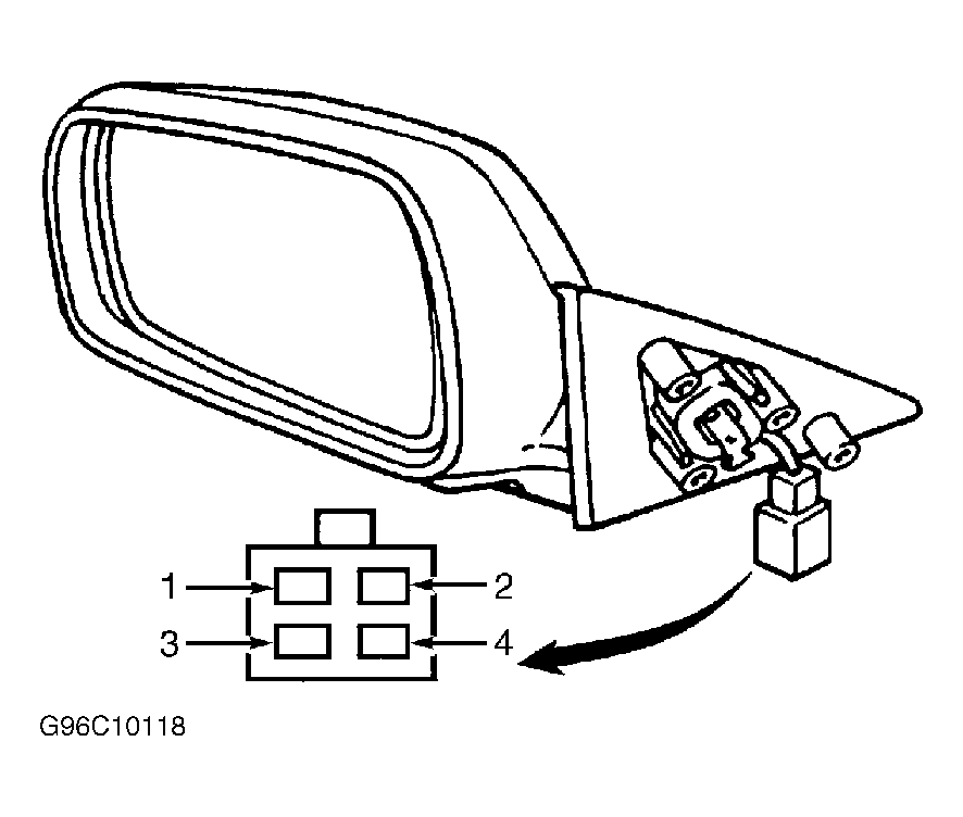 Disconnect power mirror motor connector. Check for continuity between power mirror motor terminals No. 1, 3 and 4. See Fig 1 . If continuity exists between specified terminals, motor is okay. Reconnect power mirror motor connector. If continuity does not exist between one or more terminals, replace power mirror motor.
