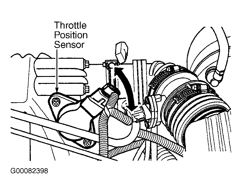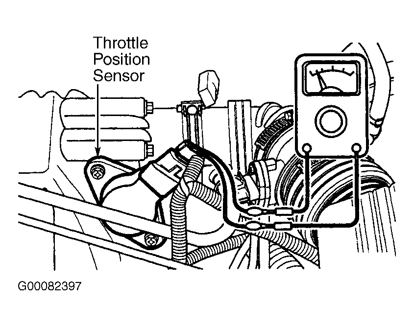 Turn ignition switch off. While backprobing TP sensor 4-pin harness connector, connect a DVOM, set to volts, between TP sensor terminals No. 1 (Yellow wire) and No. 3 (Blue/White wire). See Fig 1 and Fig 2 . Turn ignition on. Do not start engine. Measure voltage with throttle in idle position. Voltage should be 300-900 millivolts. With throttle fully open, voltage should be 4.0-4.6 volts. If voltage is not as specified, loosen TP sensor mounting bolts and adjust by turning the TP sensor. Turning TP sensor clockwise increases output voltage. Make adjustments with throttle in idle position. See Fig 3. After adjustment, torque TP sensor mounting bolts to 14-22 INCH lbs. (1.5-2.5 N.m). If problem still exists, replace TP sensor and repeat test.