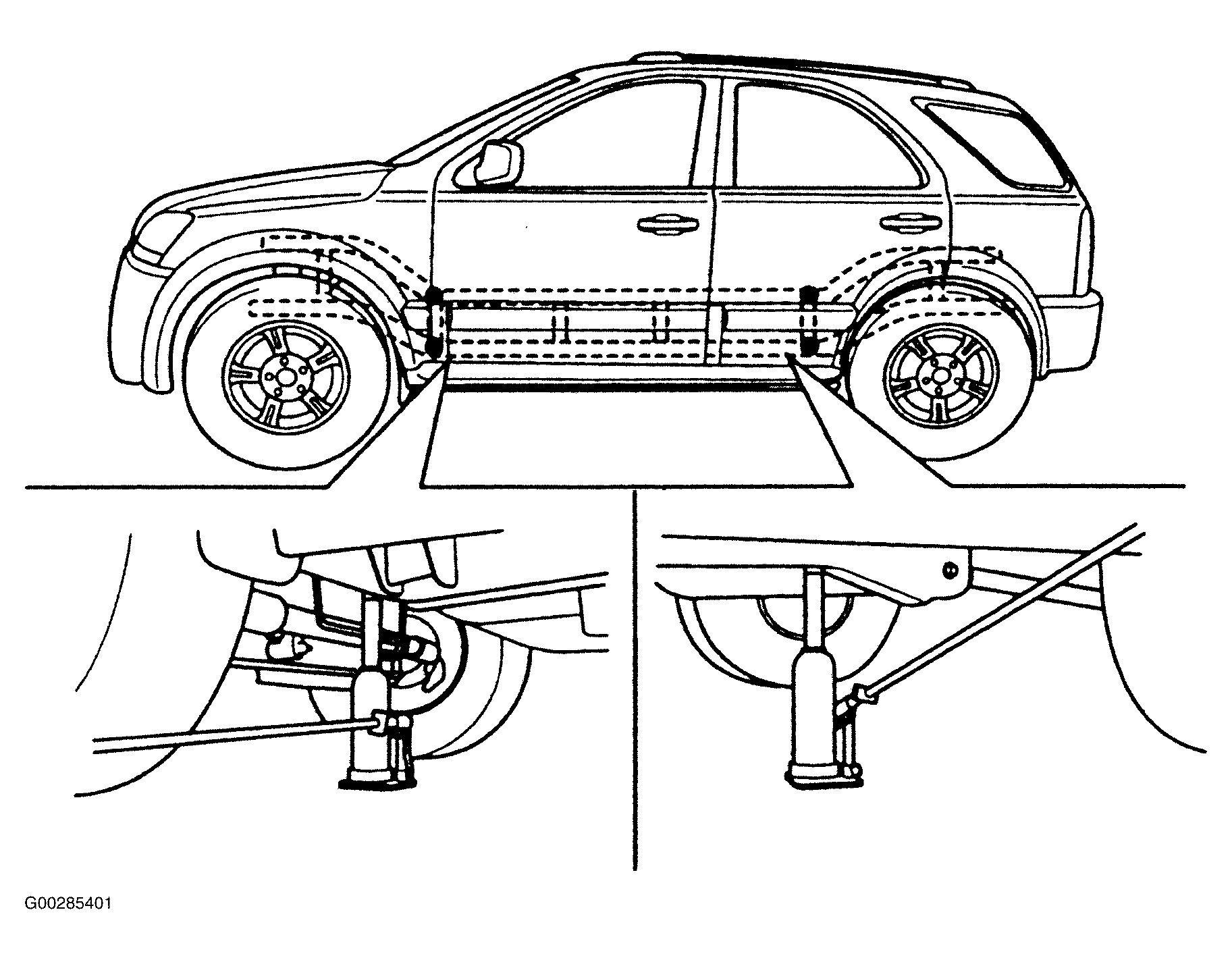 Jack points may be used for either floor jack or two-post hoist. When using hoist, use jack points on both sides.