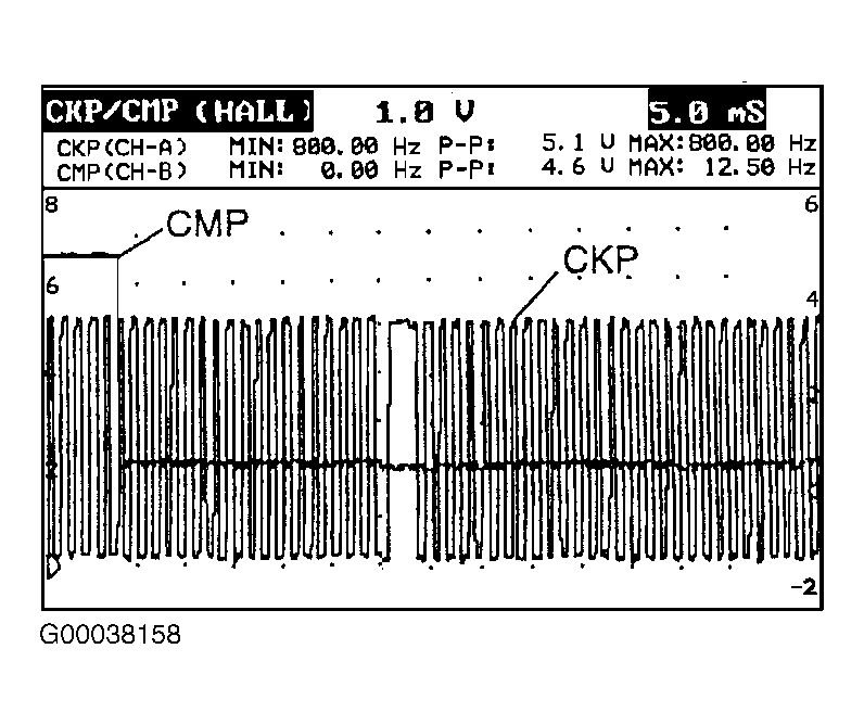 Backprobing connect lab scope positive probe to ECM connector B01 terminal No. 34 (White/Green wire) and negative probe to ECM connector terminal No. 78 (Black/Yellow wire A/T only) or ECM connector terminal No. 74 (Black/Yellow wire M/T only). See Figure. Start engine and allow it to reach normal operating temperature. With engine at idle, observe CKP waveform. Compare to normal waveform. See Fig 1. If CKP sensor waveform is erratic, replace CKP sensor.