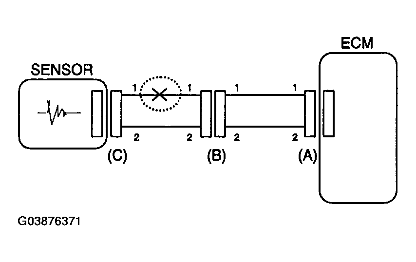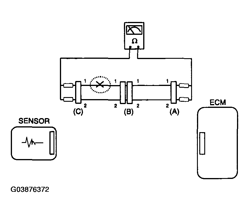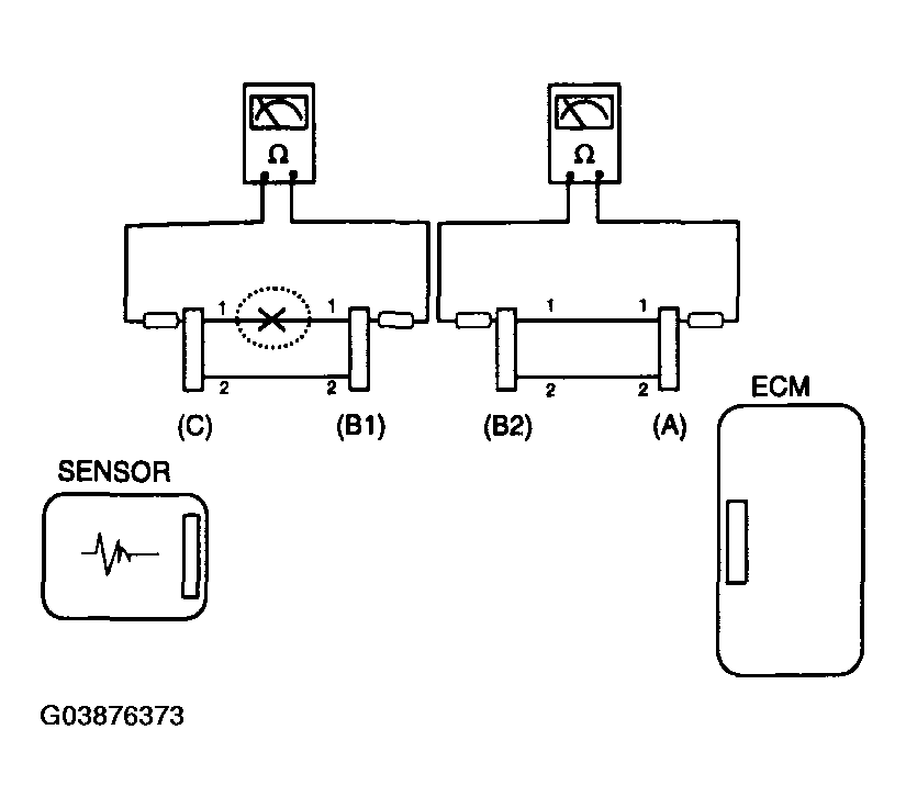 In this case the measured resistance between connector (C) and (B1) is higher than 1Mohm and the open circuit is between terminal 1 of connector (C) and terminal 1 of connector (B1).