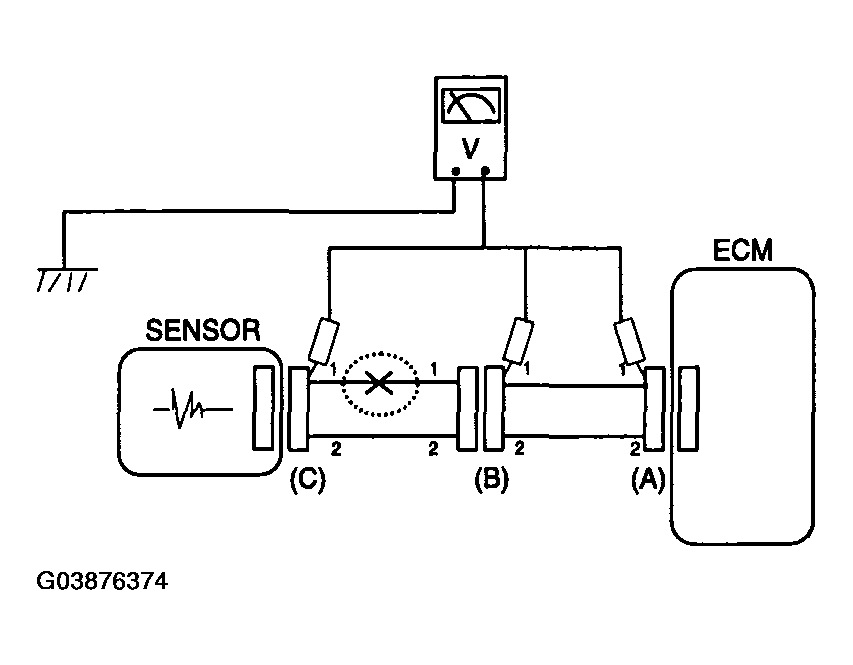 1. With each connector still connected, measure the voltage between the chassis ground and terminal 1 of each connectors (A), (B) and (C) as shown in [Fig 4 ].