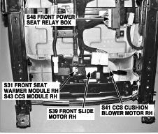 | Front Power Seat Relay Box | Under front passenger's seat. See Figure. |