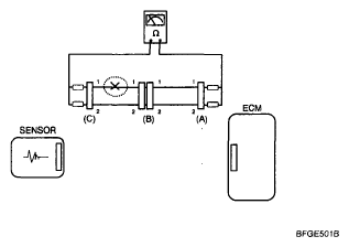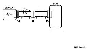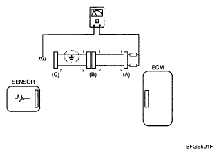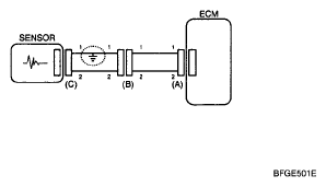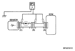 1. With each connector still connected, measure the voltage between the chassis ground and terminal 1 of each connectors (A), (B) and (C) as shown in [Fig 4].