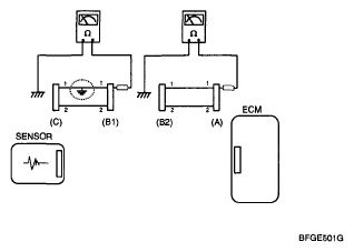 2. Disconnect connector (B), and measure for resistance between connector (C) and (B1) and between (B2) and (A) as shown in Fig 3.