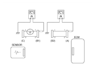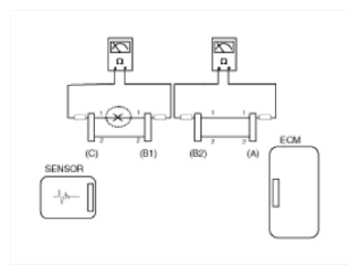 - Disconnect connector (B), and measure for resistance between connector (C) and (B1) and between (B2) and (A) as shown in Fig 3.