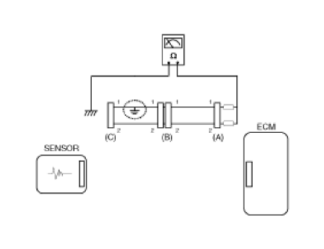 - Disconnect connectors (A), (C) and measure resistance between connector (A) and (C) as shown in Fig 2.