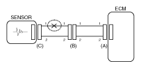 - With each connector still connected, measure the voltage between the chassis ground and terminal 1 of each connectors (A), (B) and (C) as shown in [Fig 4].