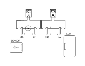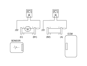 - Disconnect connector (B), and measure for resistance between connector (C) and (B1) and between (B2) and (A) as shown in [Fig 3].
