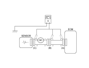 - With each connector still connected, measure the voltage between the chassis ground and terminal 1 of each connectors (A), (B) and (C) as shown in [Fig 4].