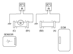 - Disconnect connector (B), and measure the resistance between connector (A) and chassis ground, and between (B1) and chassis ground as shown in [Fig 3].