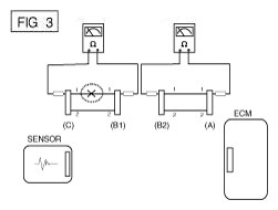 - Disconnect connector (B), and measure for resistance between connector (C) and (B1) and between (B2) and (A) as shown in [Fig 3].