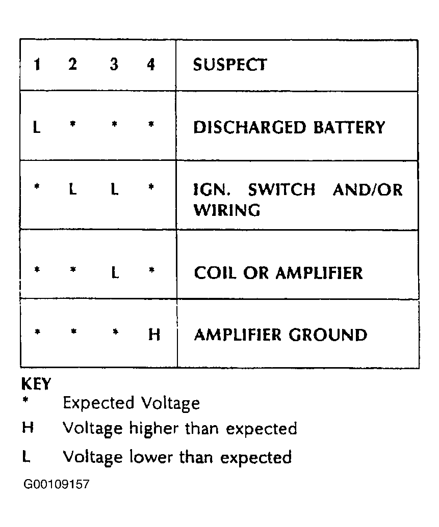 . Readings for V1 should be more than 12 volts. Readings for V2 should be 1 volt maximum below volts at V1. Readings for V3 should be 1 volt maximum below volts at V1. Readings for V4 should be 0.0-0.1 volt.