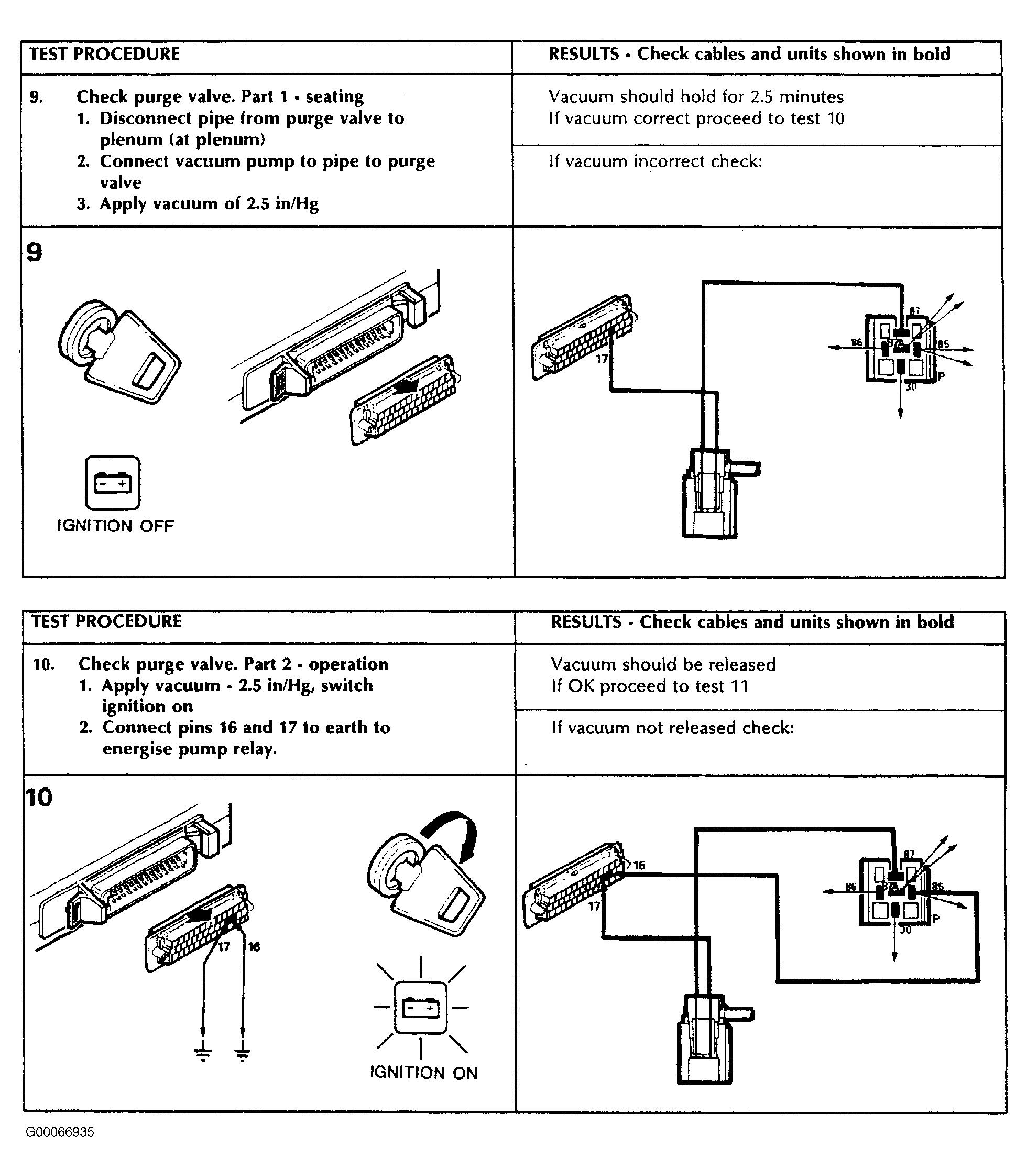Test procedure using a multimeter is carried out the same as for 1987-88 models, with addition of tests for purge control valve, air conditioning, heated front screen and condenser fan inputs. The use of a hand held vacuum pump, for example a "Mityvac", is required to carry out Tests 9 and 10. See Figure . Pin wire colors are identified in ENGINE CONTROL MODULE CONNECTOR TERMINAL IDENTIFICATION (1989) table.