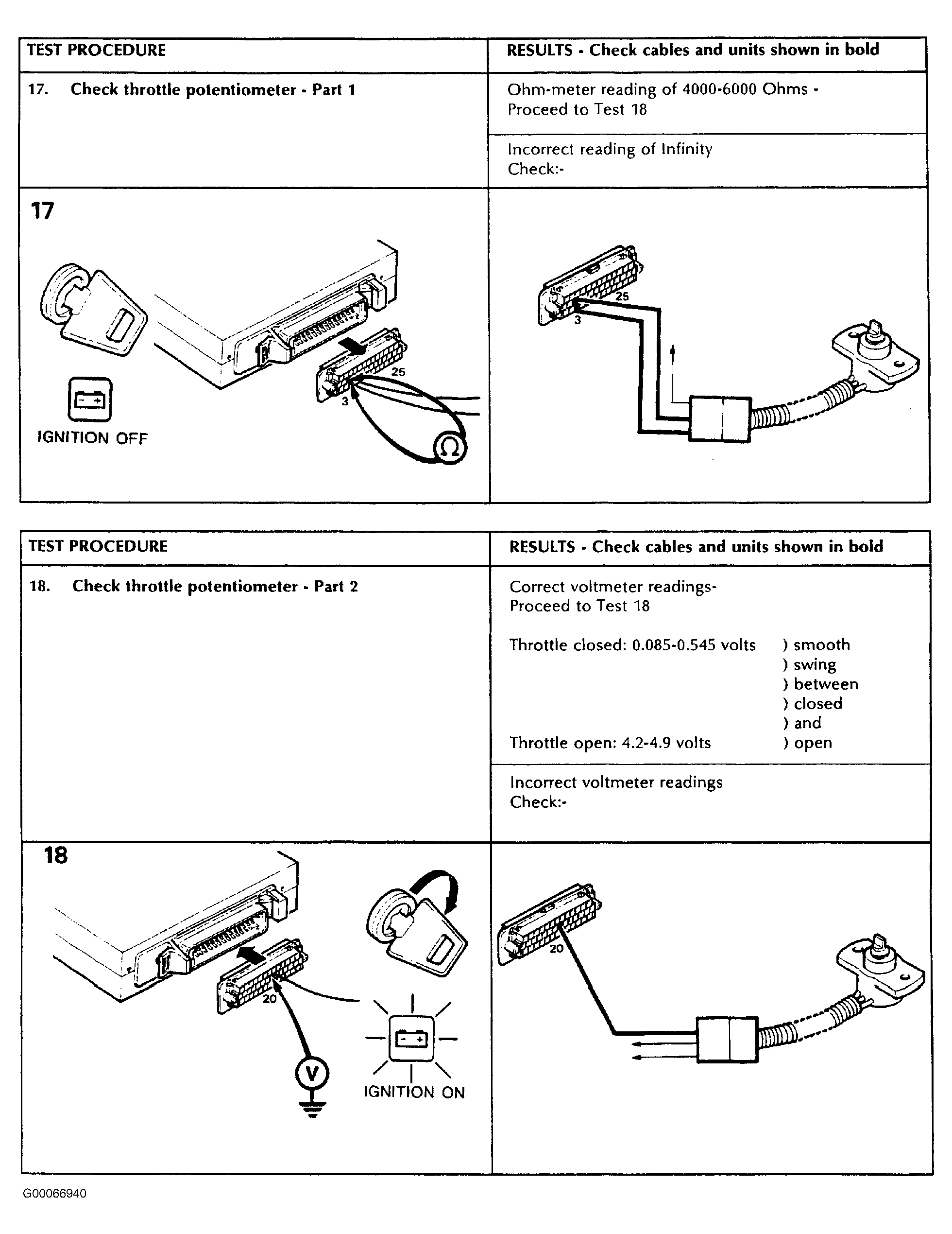 Test throttle position sensor, see Fig 1 . See appropriate WIRING DIAGRAMS article. After completing the tests, retest the vehicle to ensure the faults have been rectified. If faults still persist, recheck using Lucas Diagnostic Equipment or Test Book.