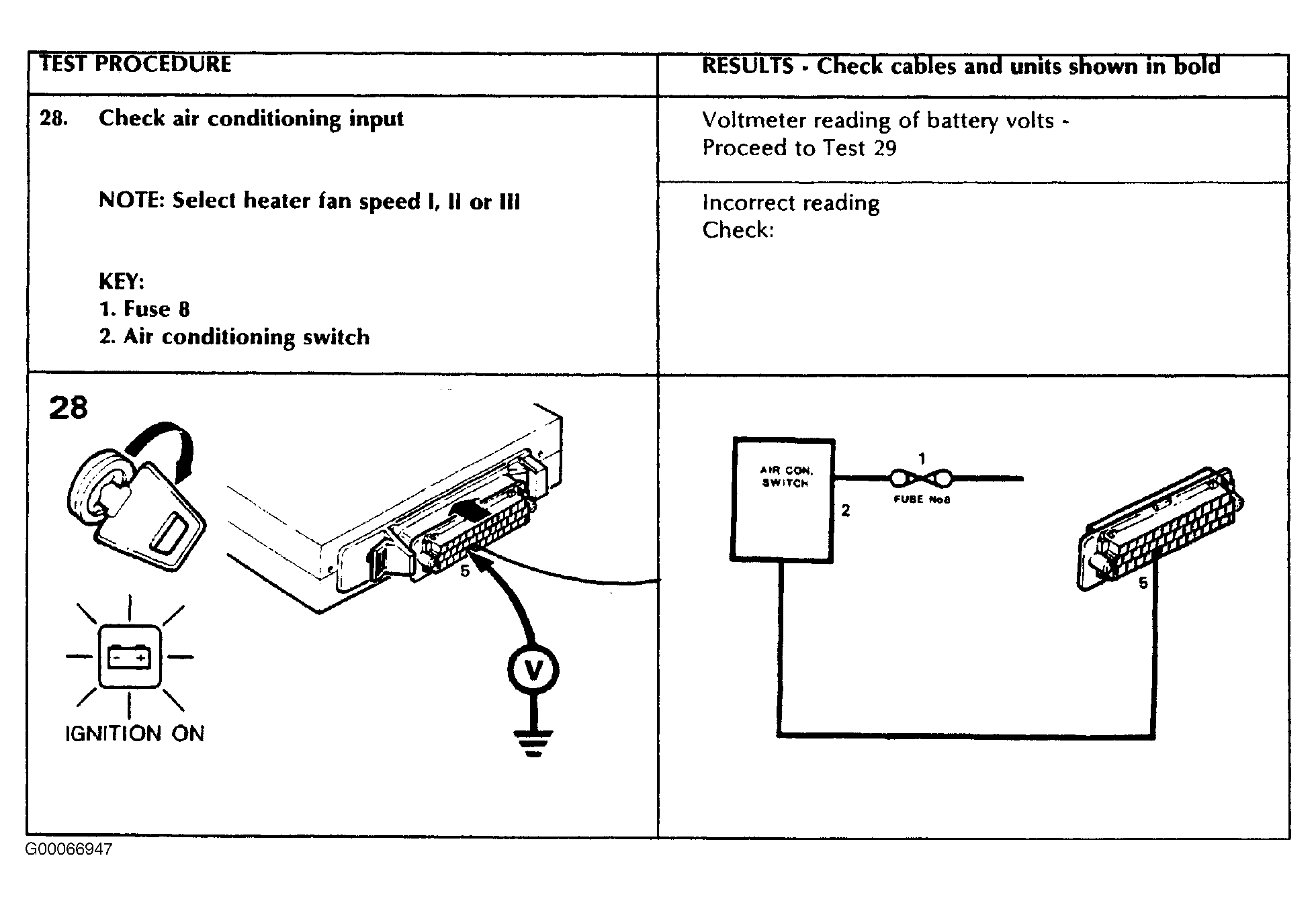 Release the Engine Control Module (ECM) connector retaining clip and remove the connector from the ECM. Access is gained by removing the front seat base trim of the right hand front seat. Remove the connector shroud and maneuver it along the harness until there is enough clearance to enable meter probes to be inserted into the back of the plug. There are six pin numbers 1, 13, 14, 27, 28 and 40 molded onto the rear of the plug as shown in the illustration below, for clarity the electrical leads have been omitted. Pin colors are identified in ENGINE CONTROL MODULE CONNECTOR TERMINAL IDENTIFICATION (1990-91) table.