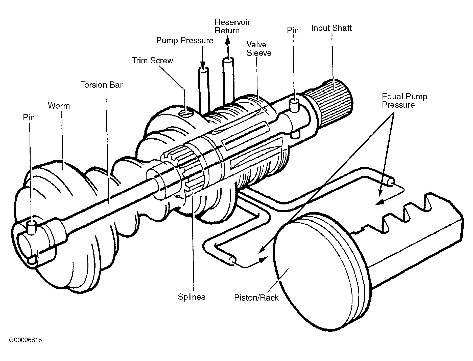 The rotary valve assembly comprises the worm. See Figure . The valve sleeve, which has valve ports in its inner bore, is a snug fit into the worm and is retained with the trim screw. The input shaft, which is attached to the steering wheel via the steering shaft and steering column, also has valve ports on its outer diameter to align with those in the sleeve. The input shaft and sleeve valve ports are held in neutral alignment by the torsion bar, which is secured with pins at each end to the worm and input shaft.