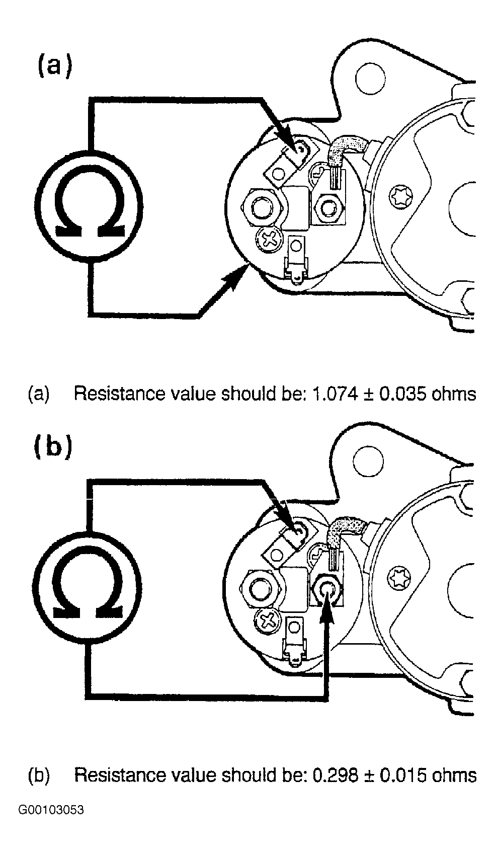 - Check continuity and resistance value of windings by connecting an ohmmeter as shown. See Fig 1