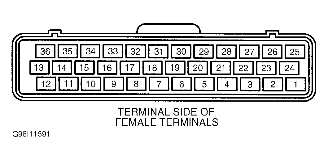 On Defender 90 and Discovery, ECM is located in the right rear corner of the engine compartment. Each vehicle has 3 ECM connectors. A Black 36-pin connector, a Red 36-pin connector and a Black 18-pin connector. See Fig 1 and Fig 2 . See ECM CONNECTOR IDENTIFICATION table.