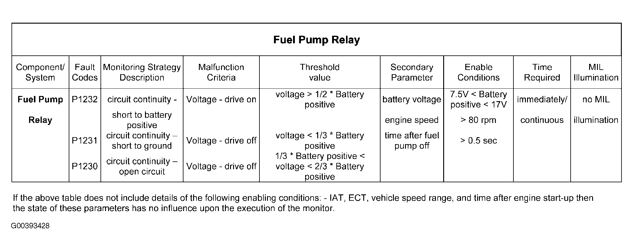 - Fuel pump relay driver open circuit, i.e. the driver voltage is greater than one third of the battery voltage but less than two thirds of the battery voltage when the driver is off.