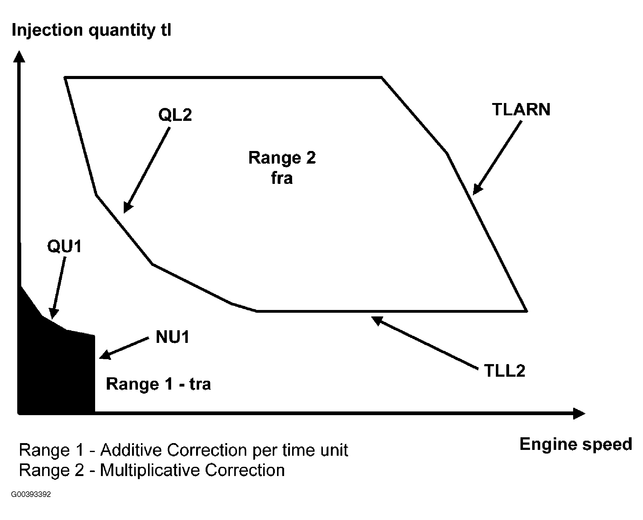 Each value is determined only within its corresponding range. But each adaptive value corrects the primary control within the whole load and speed range of the engine. After the next start, the stored adaptive values are included in the calculation of the primary fuel control; just before closed-loop fuelling control is activated.