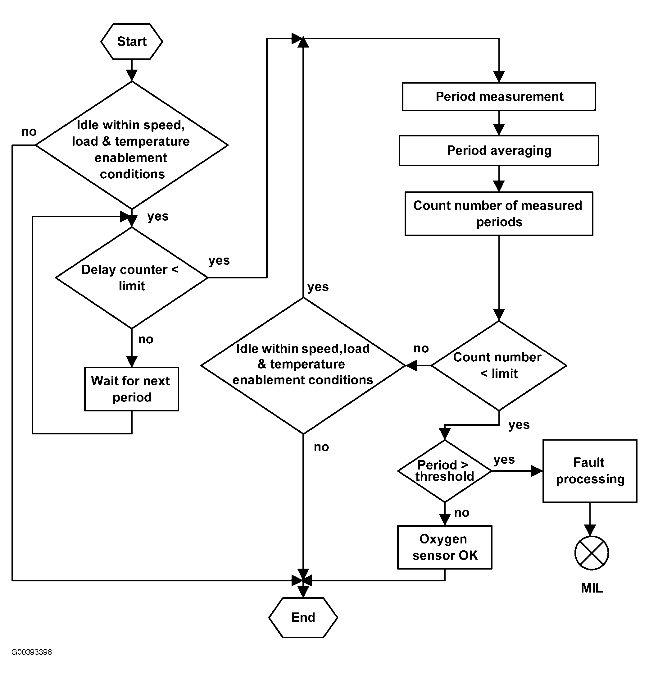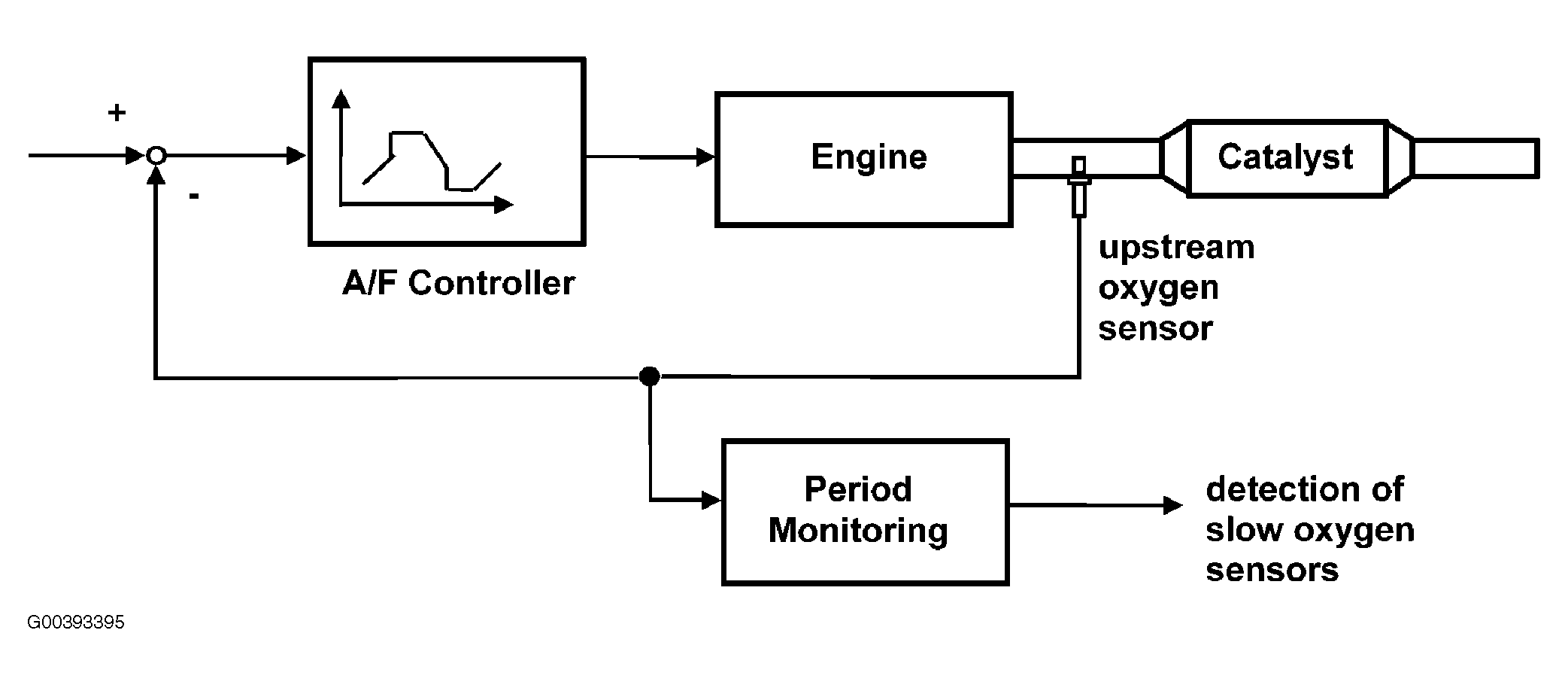 The response rates of the upstream O2 sensors are monitored by measuring the period of the Lambda control oscillations. This period monitoring allows the detection of a slow O2 sensor. See Fig 1