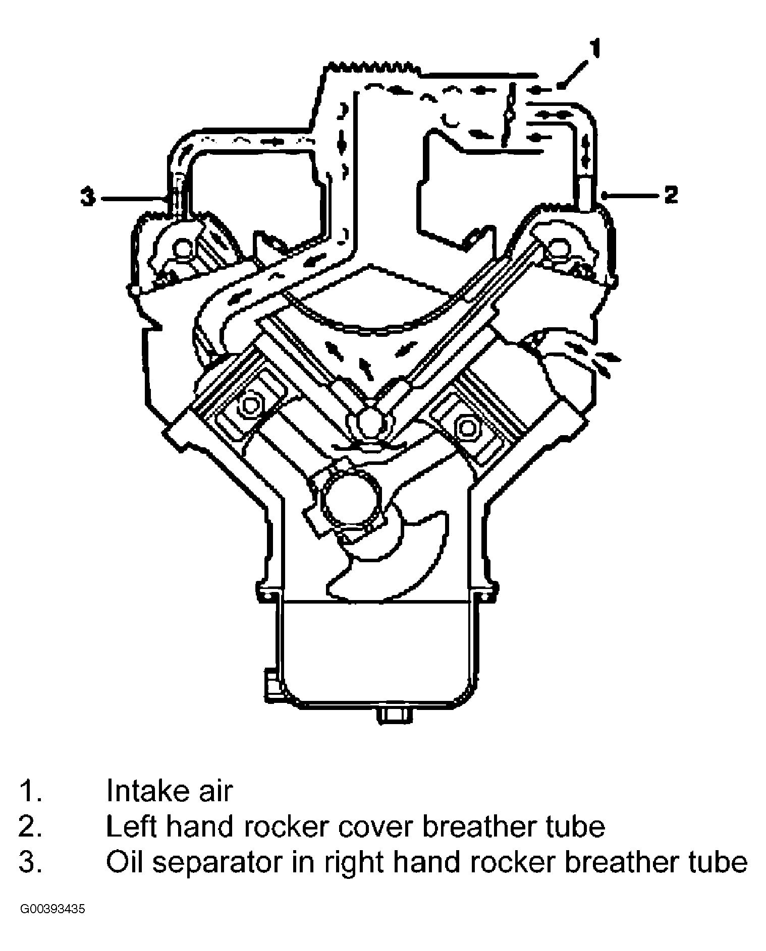 A spiral oil separator is located in the stub pipe to the ventilation hose on the right hand cylinder head rocker cover, where oil is separated and returned to the cylinder head. The rubber ventilation hose from the right hand rocker cover is routed to a port on the right hand side of the inlet manifold plenum chamber where the returned gases mix with the fresh intake air passing through the throttle butterfly valve. See Fig 1 . This pipe is primarily for part-load breathing and is connected to the engine via a restrictor that prevents an excessive vacuum building up in the crankcase at small throttle openings.
