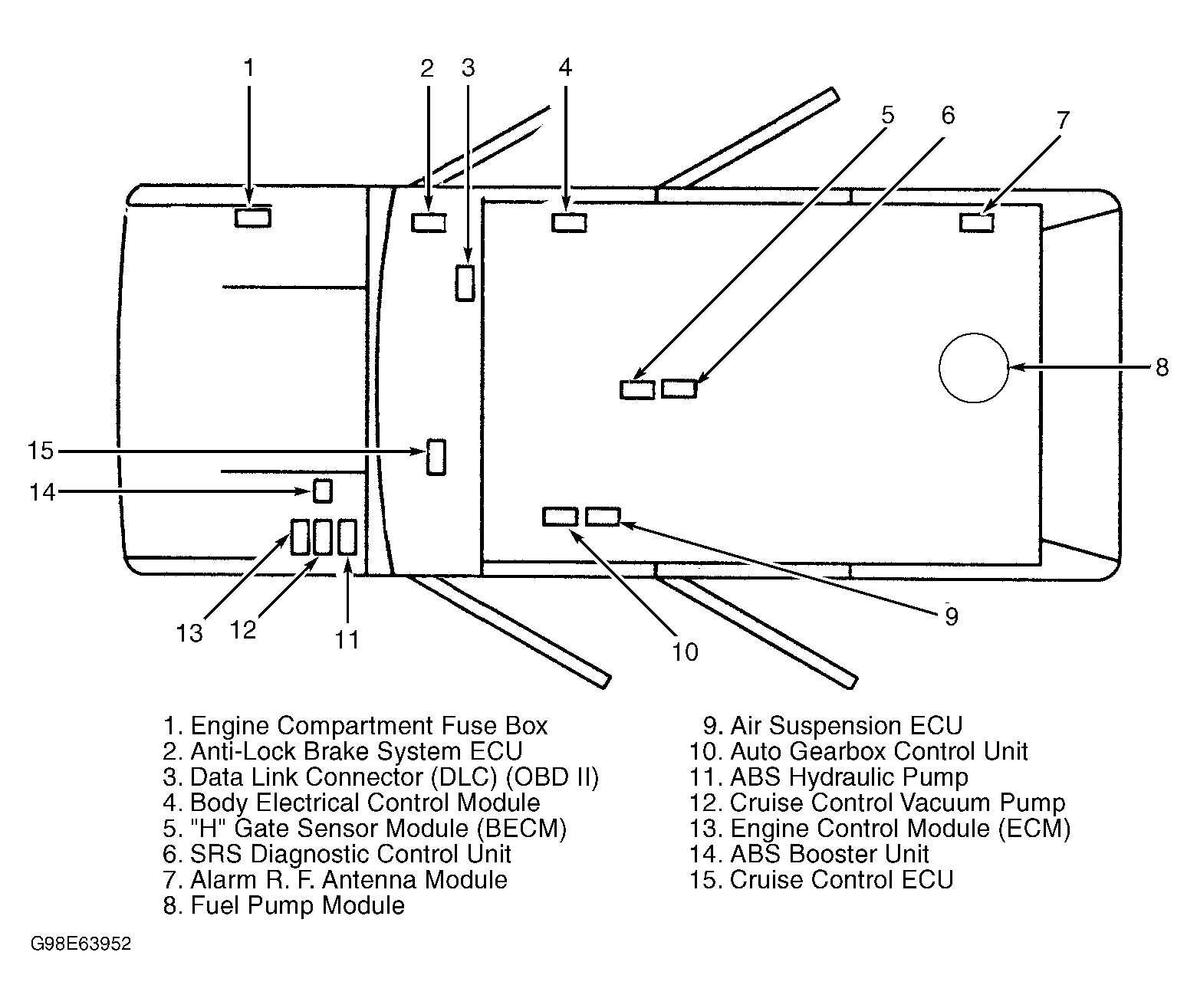 | Air Suspension ECU | Under left front seat. See Figure . |